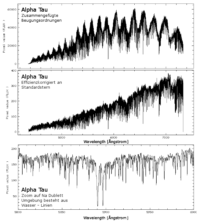 Oben: Aus den einzelnen Echellebeugungsordnungen zusammengesetztes 1D Spektrum von α Tau