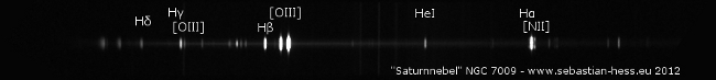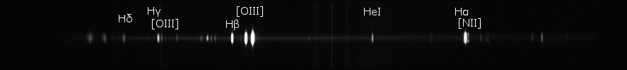 Das Spektrum dieses Planetarischen Nebels enthält natürlich auch die bekannten [OIII] Linien, die komplette Balmer - Serie bis H delta, außerdem Linien des neutralen Helium sowie die ebenfalls verbotene Linien des einfach ionisierten Stickstoffs [NII]. Beide verbotenen Linienpaare entstehen als magnetische Dipolübergänge (M1) durch Spin-Flip 1D2 -> 3P2 und 1D2 -> 3P1. Zu allen Linien könnte auch der Elektrische Quadrupol - Übergang einen Beitrag liefern. Die dafür notwendige, doppele Drehimpulsänderung ist jedoch nochmals um einige Größenordnungen unwahrscheinlicher als die Spin - Flip Anteile und trägt daher allenfalls geringfügigst bei. Interessant ist auch das ausgeprägte Kontinuum, welches im Wesentlichen durch Einfangprozesse sowie Stöße zwischen den Elektronen und (hauptsächlich Wasserstoff-) Ionen.