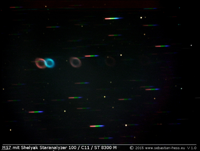 Planetarische Nebel gehören ohne Frage zu den spannendsten Deep-Sky Objekten för objektivspektroskopische Aufnahmen. Bei diesen Nebeln dominieren die verbotenen [OIII] Linien des zweifach ionisierten Sauerstoffs und das Hα Leuchten des Wasserstoffs. Da diese beiden Linien spektral weit auseinander liegen (sehr unterschiedliche Farben besitzen), lassen sich mit einem Objektivspektrometer hier zweidimensionale Abbilder der Elementverteilung erstellen. Bei manchem "PN" sind auch noch andere Elemente und Linien deutlich sichtbar und eignen sich für die Darstellung mit dem Objektivspektrometer.